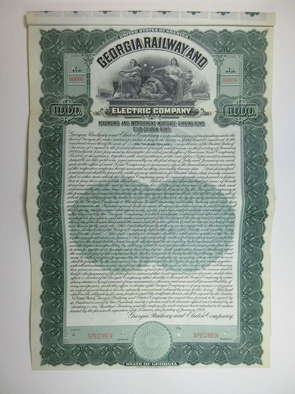 Georgia. $1,000 Specimen 5% Refunding and Improvement Mortgage Sinking Fund Gold Coupon Bond, Black print on green border and under tint, Allegorical women sitting besides generator sandwiched between company title, Specimen overprints and POC's, VF-XF condition, ABNC. Only known as a specimen in Cox.