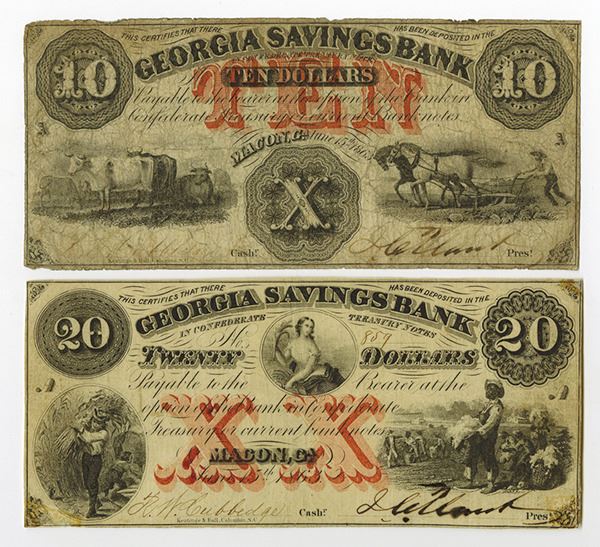 Macon, GA., Lot of 2 issued obsoletes, Includes $10, Fine to Choice Fine and $20, VF to VF+ with mounting remnants on corners, still scarce and very attractive, Keatings & Ball. (ex- Jack Guevrekian Collection/NASCA, 1977).