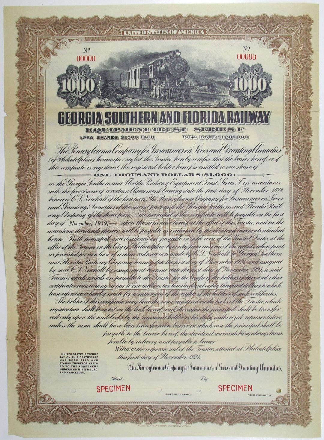 Georgia and Florida, 1924. $1000 Specimen 4.5% Equipment Trust Bond, Black text with brown border and undertint, Train passing by on tracks at top center. Red specimen overprints, 00000 serial numbers, and POCs. VF condition, ABNC. Only known as a specimen in Cox. This was one of 2 examples found in the ABN Archives in 2002, this is the only one available.