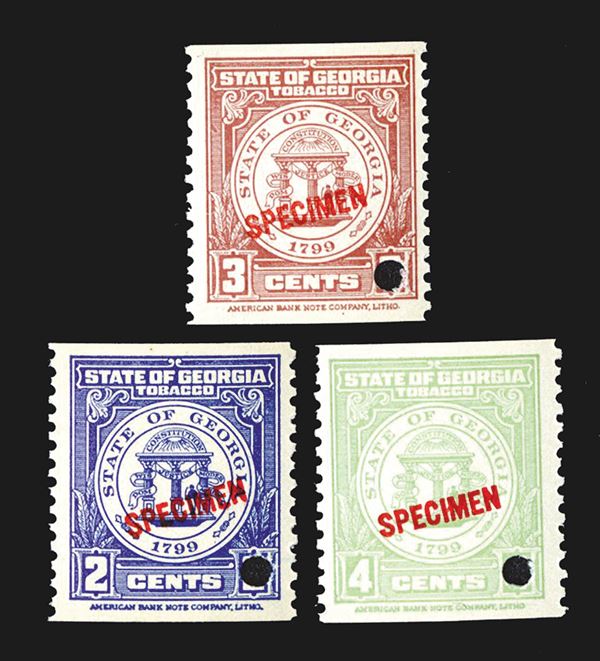 GA. Georgia State Tobacco Stamps. 2c, 3c, 4c. Specimen, POC. Original gum, never hinged. ABNC. 3 pieces.