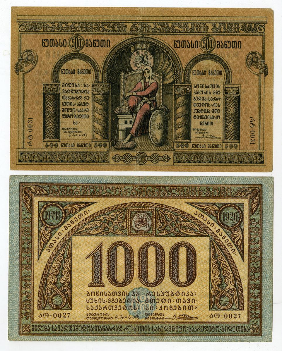 Georgia, 1919-20. Lot of 2 Banknotes, Includes: 500 Rubles, P-13b, Black-green on red-brown underprint, Woman seated with shield and lance at center; 1000 Rubles, P-14b, Brown on blue and tan underprint, Denomination on face. Notes are in XF-AU condition. (2). Sold "AS IS" no returns accepted.