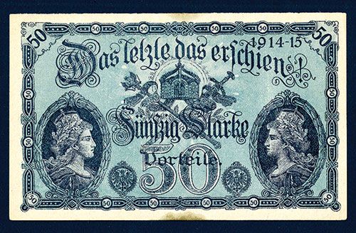 Germany, 1914-15, 50 Denomination, P-Unlisted, Dark blue on blue, Text states in German “Das Letzte das Erschein Funfzig Starke Vorteile” (The last thing pops up fifty strong advantages), back blank, toning on bottom otherwise Choice AU to Uncirculated. Scarce German satirical note.