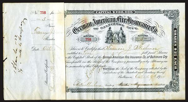 Maryland. I/U Shares of Capitol Stock. Vignette of allegorical women holding shields top center flanking a small framed monument, Fine condition lot, A. Hoen & Co. Lith.