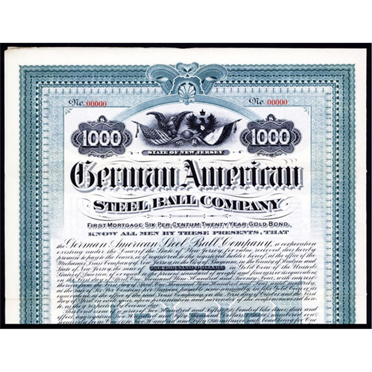 Germany and U.S.A. 1904. Specimen bond. $1000. 1st Mortgage 6% Gold Bond. Vignette of German flag and arms and American eagle and flag. Coupons attached. Red specimen overprint and POC. ABNC. Very attractive bond.