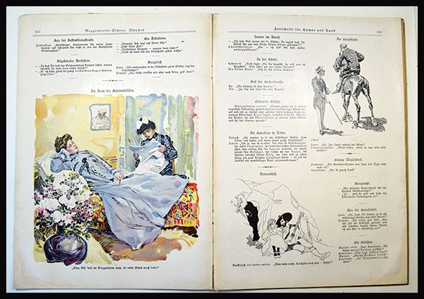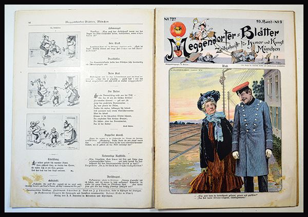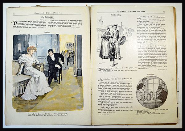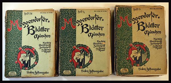 Meggendorter Blatter Munchen. Farbig illustrierte Zeitschrift fur Humor und Kunst. Coated stock pages, some of which are in color are nice. Pulp add pages are in worse shape, and the pulp covers are detached and chipping. A variety of issues from 1902-1904. Great illustrations and ads. Some are water damaged, musty. Nearly 20 pounds.