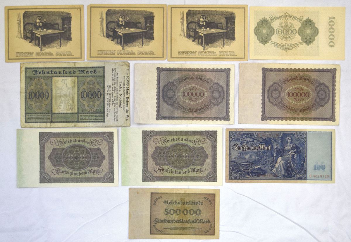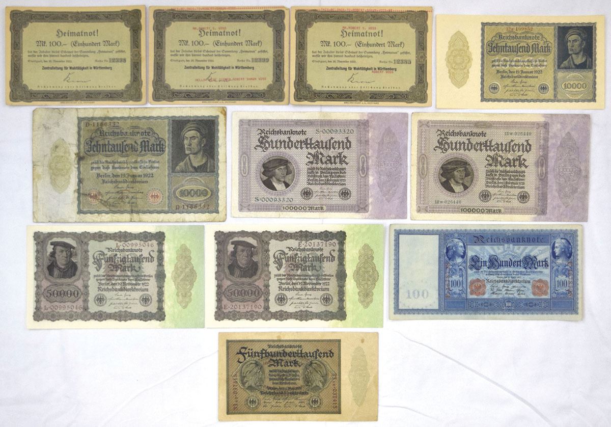 Germany, 1910-23. Lot of 11 Issued Banknotes from Various German Banks, Includes: 1922, Wurttemberg Central Office for Welfare, 100 Mark (3), Unlisted; Reichsbanknote, 1910, 100 Mark, P-42; 1922, 10,000 Mark Propaganda Banknote of P-70; 1922, 10,000 Mark, P-72; 1922, 50,000 Mark, P-79 (2); 1923, 100,000 Mark, P-83a (2); 1923, 50,000 Mark, P-88b. Notes range from Fine to AU condition. (11). Sold "AS IS" no returns accepted.