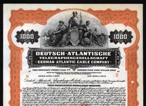 1925, $1000. 1st Mortgage 20 Year 7% Sinking Fund Gold Dollar Bond, Orange border and underprint, Allegorical woman with shield flanked by seated man and woman. Pin Punch "Specimen Hamilton Bank Note" and POC's. "Deutsch-Atlantische Telegraphengesellschaft". Coupons attached. XF condition. From a new find of Hamilton BNC specimens and proofs. Rare German Telegraph bond and one of 2 found and the only one available. HBNC.