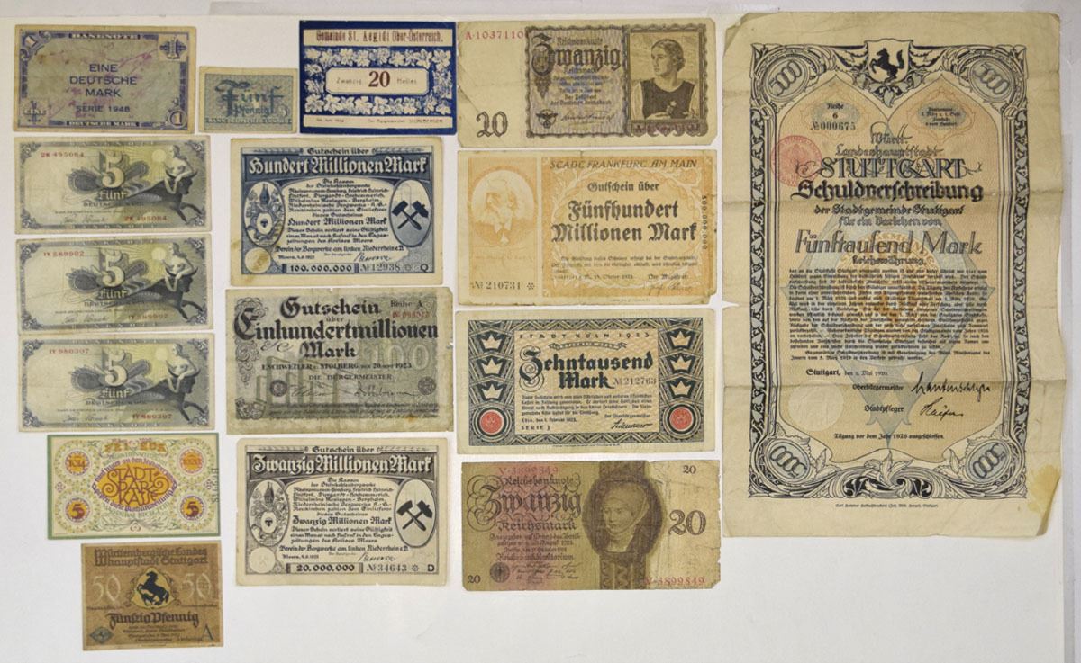 Germany, 1920-48. Lot of 16 Banknotes, Includes Notgeld from Bielfeldt, St. Aegidi, Esschwieler, and Furth. Also includes: Retechsbanknote, 1924, 20 Mark, P-176; Reichsbanknote, 1939, 20 Mark, P-185; Bank Deutscher Lander, 1948, 5 Pfennig, P-11a; German Federal Republic, 1948, 1 Mark, P-2a; 1948, 5 Mark, P-13a (3), and more. Notes range from Fine to AU condition. (16). Sold "AS IS" no returns accepted.