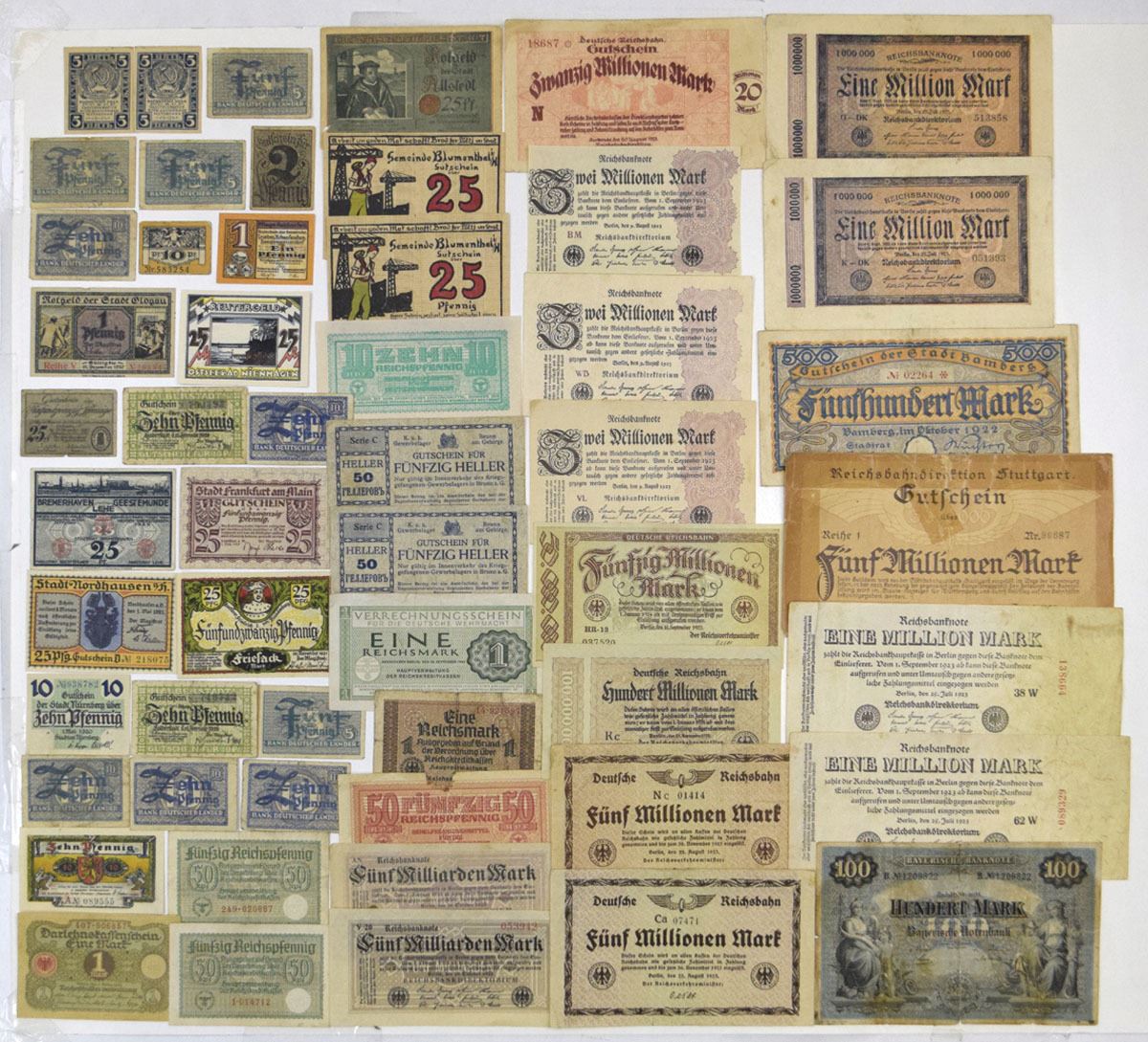 Germany, 1900-20s. Lot of 54 Issued Banknotes and Notgeld from Various German Cities, Includes: Bremerhaven, Geestemunde, Lehe, Nordhausen, Friesack, Frankfurt, Mecklenburg-Schwerin, and many more. Notes range from Fine to XF condition. (54). Sold "AS IS" no returns accepted.
