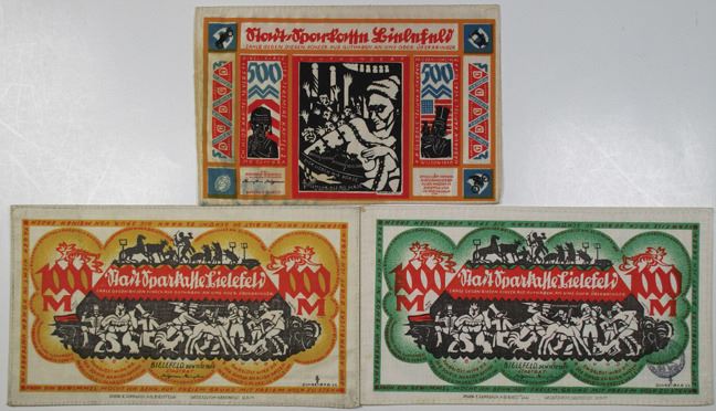 Bielefeld, Germany. Lot of 3 notes, colorful linen or silk 500 and 1000 (2) Mark Notgeld. About to Choice Unc. (3)