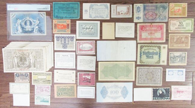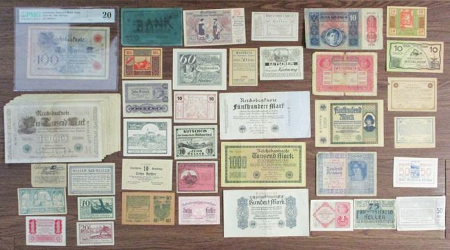 Germany, 1898-1922. Lot of Issued Banknotes, highlights include: 1916, German East Africa, Deutsche-Ostafrikanische Bank 5 Rupien, P-36e, VF; Reichsbanknote 100 Mark, P-20a, PMG graded Very Fine 20; 1000 Mark, P-44b (18) Choice XF to AU condition, nice and fresh appearing; 1000 Mark, P-45b (3); and 24+ Austrian Notgeld. Notes are VF to CU condition. (58). Sold "AS IS" no returns accepted