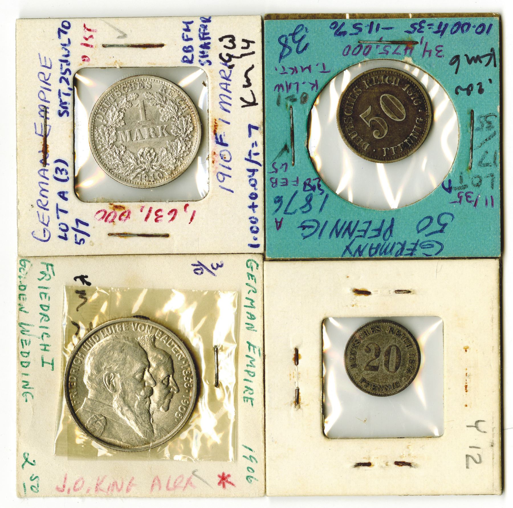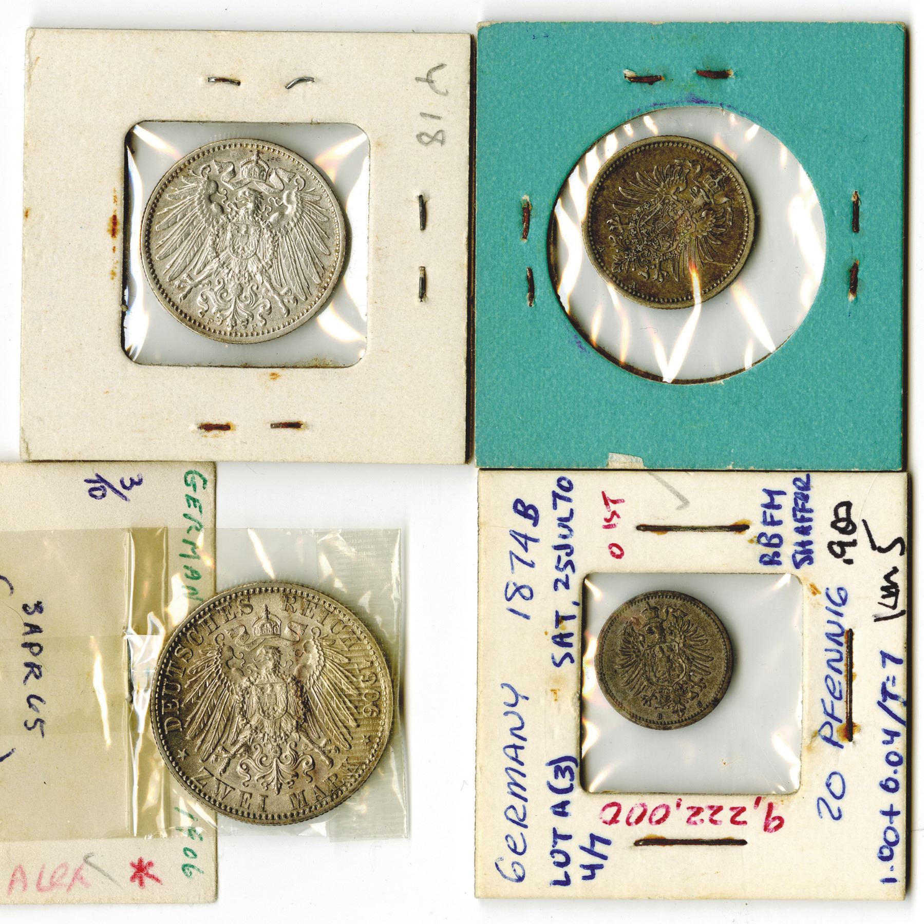 German Empireƒ.. Lot of 4 coins, including: 20 Pfennig, 1874B, KM-5, Choice XF; 50 Pfennig, 1876, KM-6, VF; 2 Marks, 1906, KM-276, AU to Uncirculated; and 1 Mark, 1910, KM-14, XF to AU. (4)