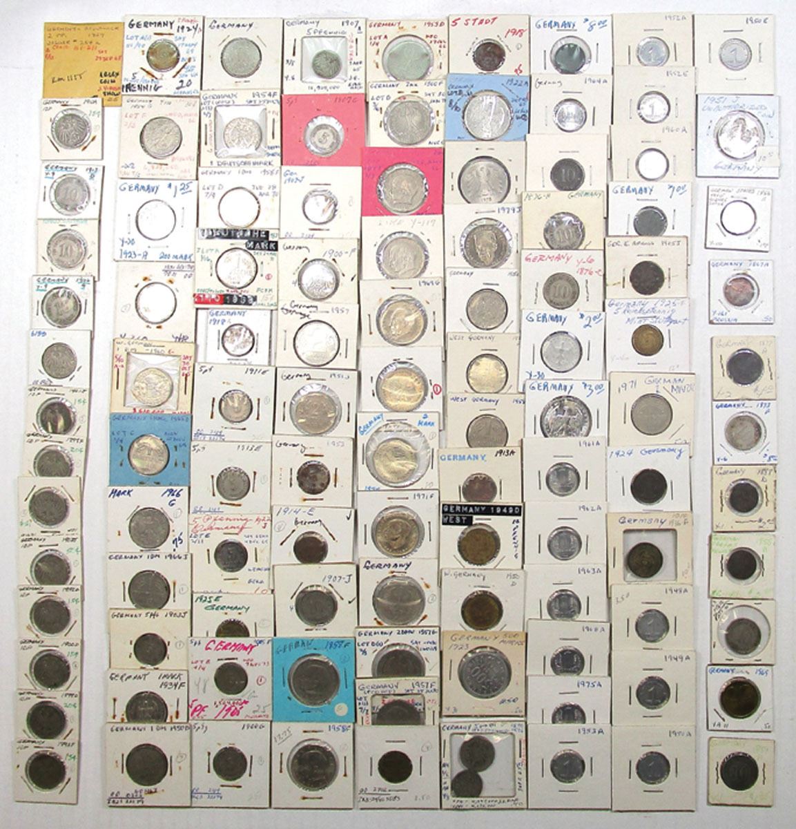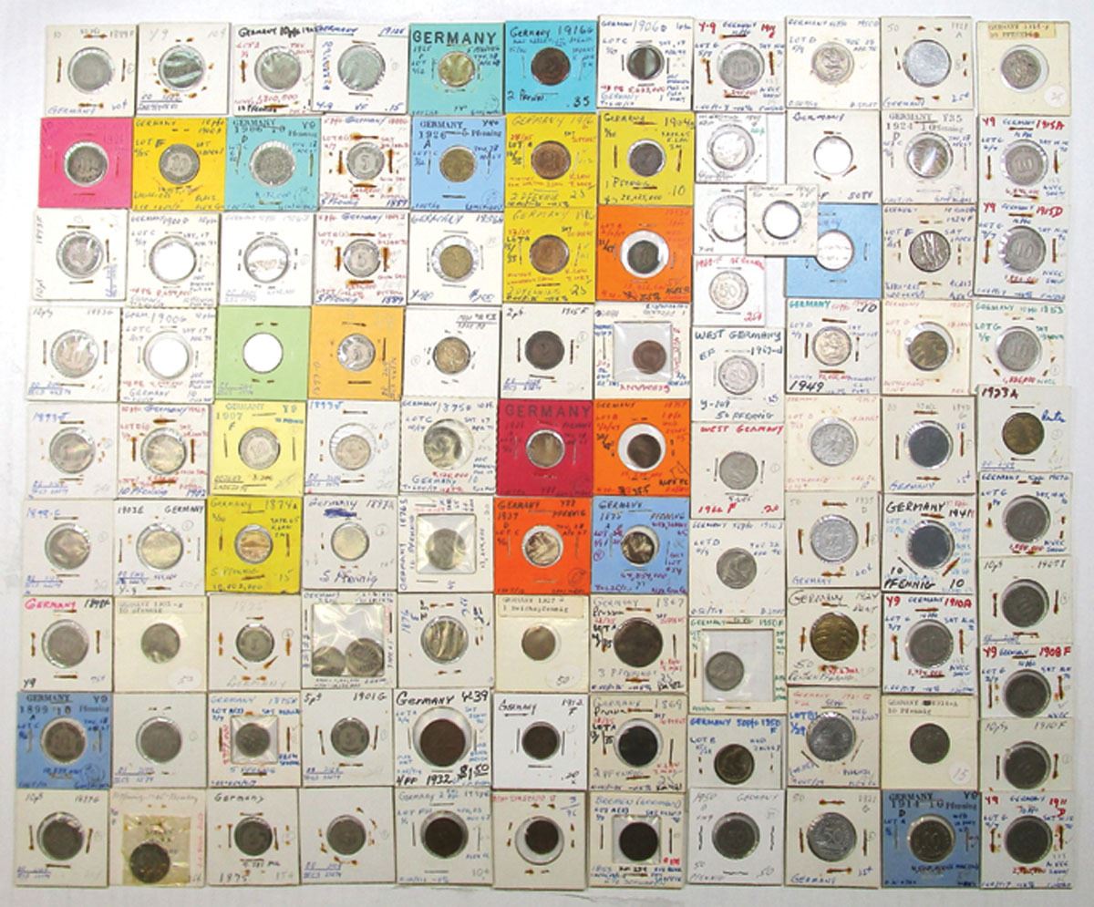 Germany, 1850-60s. Lot of 200+ Coins from Various German City States and Provinces in individual flips, Coin info is written on flip. Coins range from Fine to XF condition. Unsearched from an old estate find. (200+) Sold "AS IS" no returns accepted.