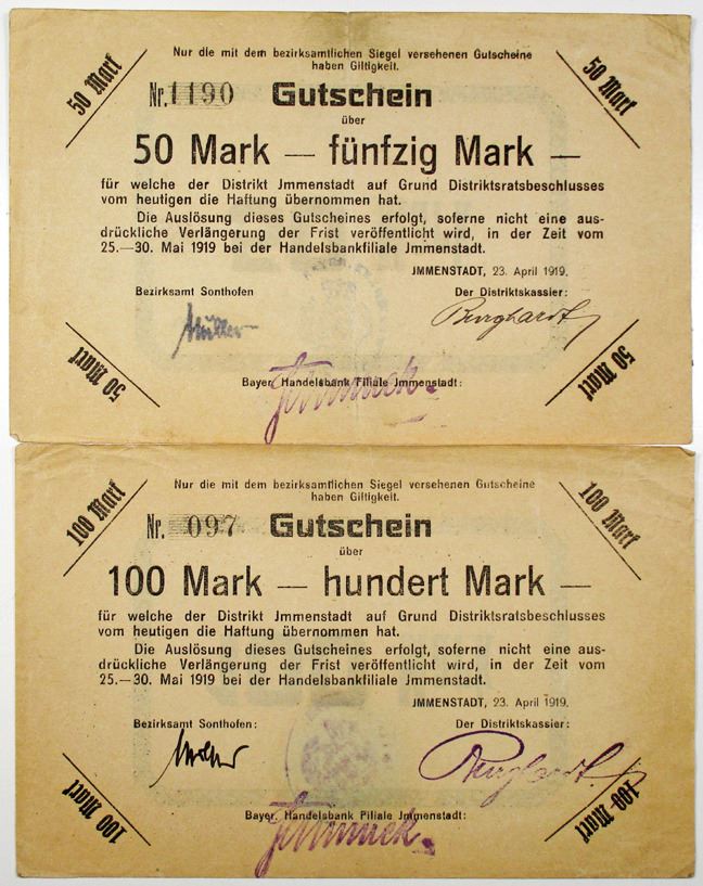 Immenstadt, Germany, 1919. Lot of 2 Issued Notgeld Banknotes, likely from a Bank in Immenstadt: 50 Mark and 100 Mark. Both are in VF condition. (2)