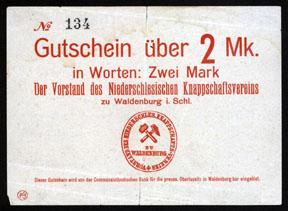 Waldenburg. ND (ca.1920-1940). 2 Mark. P-Unlisted. Vorstand des Niederschlesischen Knappschaftsvereins zu Waldenburg. Red on white scrip note. The note is managed or guaranteed by the Communalstandische Bank. Serial #134. Back has purple handstamp "Ungultig" or Invalid cancelling the note. Strong vertical fold in middle with slight separation at top and bottom. Scarce note.