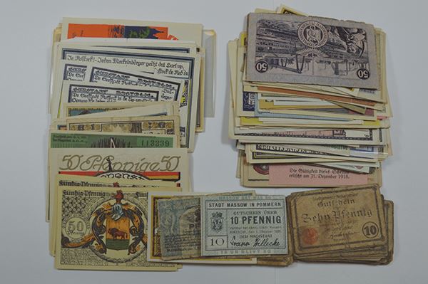 Germany. Notgeld. 1916-1923. A few highlights include Julich notes featuring siege coins of 1621 and issues from Koln, Lauenburg, Mainz, Mulhausen, Munster, Niebull, Saalfeld, Saarbrucken and others. Generally Very Fine or better, however a bunch are Good to Very Good. A few with pencil notations in a corner. Over 180 pieces.