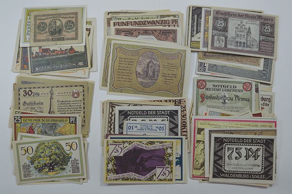 Germany. Notgeld. 1918-1922. Includes: Suchsdorf, Sulze, Triebes, Tangermunde, Tessin, Thesdorf, Weida, Weimar, Westerburg, Waldenburg, Waren, Wasserburg, Ulm, Zwickau, Ziegenruck, Zeulenroda, Mostly Fine to Very Fine, Many Uncirculated. Over 190 pieces.