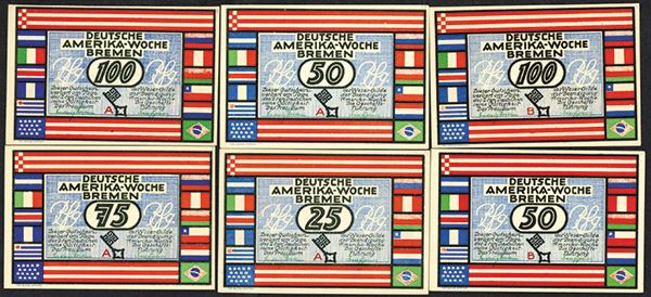 Germany. Notgeld. 1923 German-American Week Bremen. 25, 50 (2), 75, 100 (2) pfg. Scenes of Bremen, NY, Rio. 6 pieces.