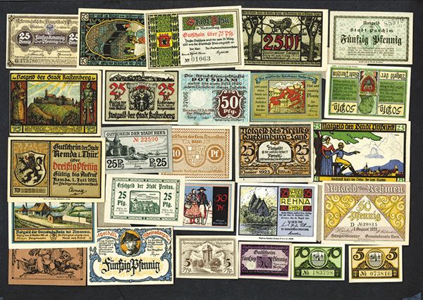 Germany. Notgeld. 1920-22 Issues. Includes: Parchim, Paulinzellaer, Penkun, Plathe, Plau, Potsdam, Possneck, Prenzlau, Putlitz, Pyrirz, Raftenberg, Rees, Rehmen, Rehna, Reichenbach, Remda, Rheinsberg, Roda, Rodach, Ronneburg and others. Mostly EF to Uncirculated. Over 50 pieces.