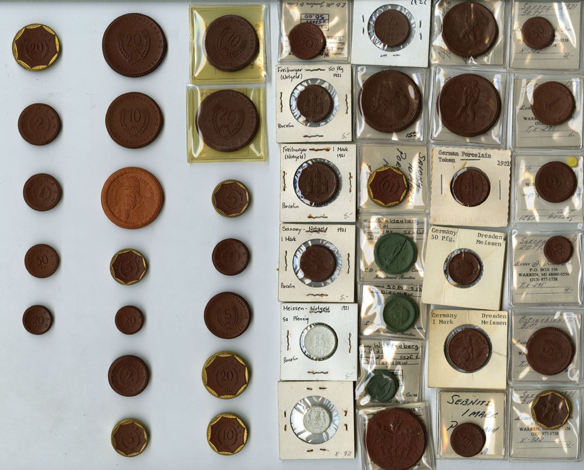Germany, 1915-23. Lot of 40+ Porcelain Notgeld Coins from various German City States and Provinces, Coins range from VF+ to Uncirculated condition. The German porcelain Notgeld were made between the years 1915 and 1923, in the years before the German Hyperinflation, and a shortage of small change. Most of the porcelain Notgeld were produced for collectors in sets. These special form of coins were struck in Meissen in Saxony in the years 1921 to 1923. Most of the coins were made in red Böttgerstoneware, but also in white porcelain. Some of them are partly gilt. They were issued for the province Saxony in the cities Meissen and Freiberg, the state of Thuringia in the city of Eisenach, in Silesia in the city of Münsterberg and in Saxony-Anhalt in the city of Quedlinburg. Building on the popularity of these tokens, Meissen continued to strike Medals in porcelain and stoneware. (44). Sold "AS IS" no returns accepted.