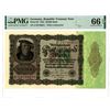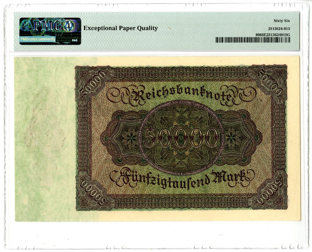 Germany, 1922. 50,000 Mark, P-80, Issued Banknote. Black and brown printing on m/c underprint. S/N E19749051. PMG graded Gem Uncirculated 66 EPQ. Only 2 notes grade higher in the PMG census out of 55 graded.