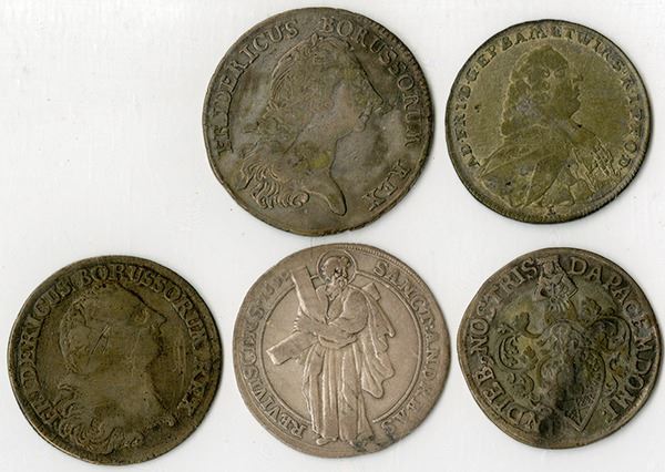 German States. Lot of 5 coins, Includes 1/3 Thaler, 1690; 1/2 Thaler, 1767; 20 Kreuzer, 1763; 1/3 Thaler, 1796; 6 Mariangroschen, 1689. Very Good or a bit better. 5 Pieces.