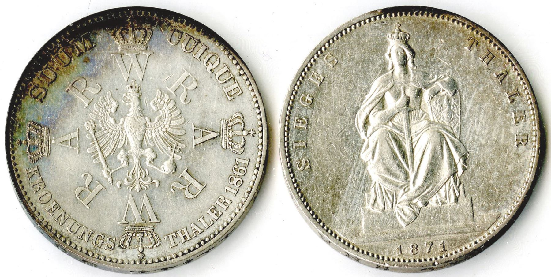 German States... Pair of coins, including: 1 Thaler, 1871, KM-5; and 1 Thaler, 1861, KM-438, Choice XF to AU condition, the 1861 coin has been cleaned. (1.07 ounces of silver). (2)
