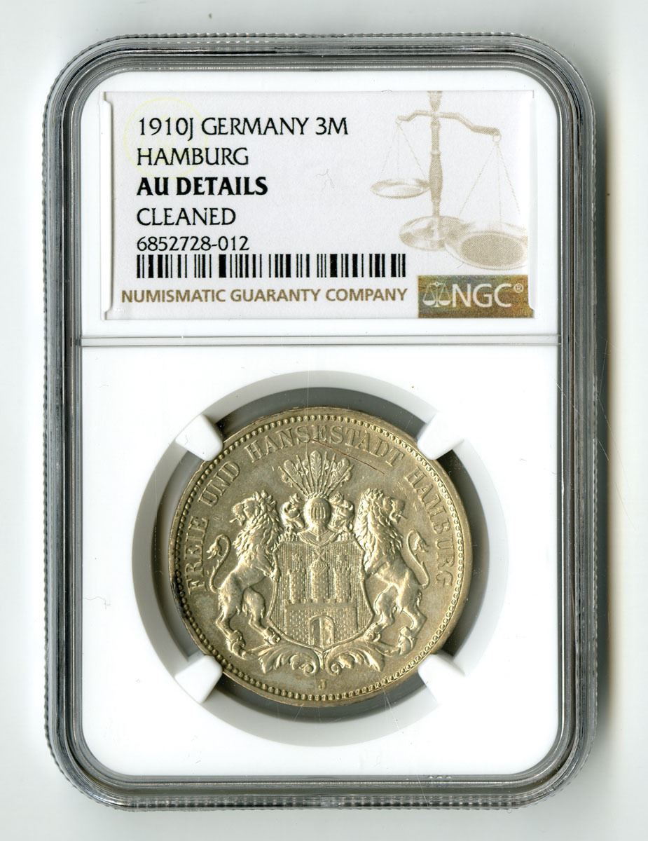 Germany, 1901, Hamburg, 3 Mark, KM#609; obverse with city view with towers; rev. Imperial eagle; struck at Hamburg Mint (J); graded NGC AU Details (Cleaned). (It has .4823 oz of .999 Silver)