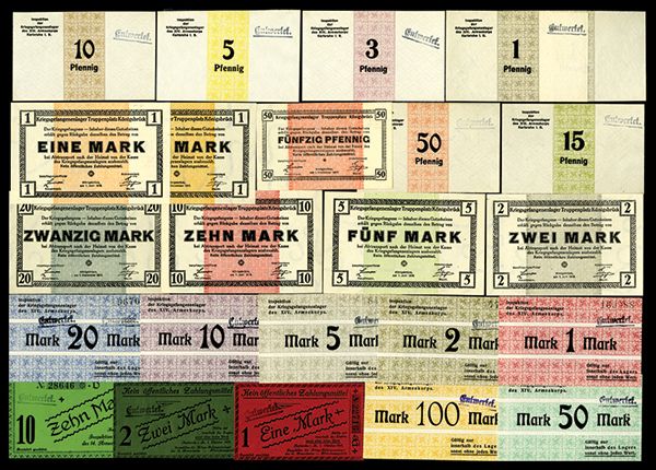 German WWI POW Camps in Karlsruhe and Koenigsbrueck, Lot of 24 Pieces Germany, lot of 24 issued war time notes, including POW 1-, 3-, 5-, 10-, 50 Pfennig and 1-, 2-, 5-, 10-, 20-, 50-, 100 Mark from Karlsruhe (17 pcs); and 50 Pfennig, 1-, 2-, 5-, 10-, 20 Mark from Koenigsbrueck. Attractive lot.