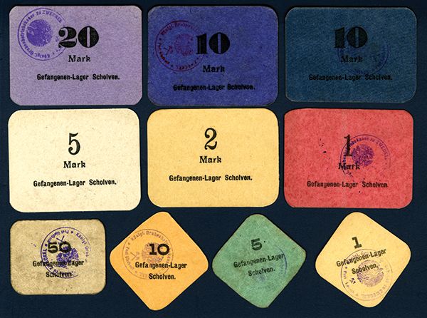 German WWI POW Labor Camp in Sholven, Lot of 10 Pieces Germany, lot of 10 issued war time notes, all small size cardboard money type, including 1-, 5-, 10-, 50 Pfennig, 1-, 2- , 5-, 10-, and 20 Mark notes.