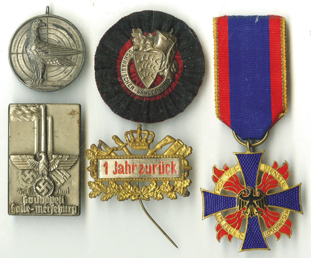 Germany.... Lot of 5 pieces, Includes: German Chorus Association pin, German text in circle with shield and metal design at right, all surrounded by black and red fabric, pin on back with Mayer & Wilhelm imprint; 1 Jahr Zuruck pin, gold design with crown at top, laurel at bottom; Germany, Third Reich. A 1935 Gauappell Halle-Merseburg Badge, German eagle with factory smokestacks in background, pair of Swatiskas as well; German eagle medal on obverse, reverse has German text underneath village; German Fire Brigade Honor Cross Medal, red blue and yellow ribbon, blue cross at center with black eagle, red flames curling towards, German text in gold circle surrounding the piece. (5)