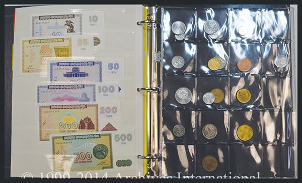 German and Russian Bonds, Mostly European Coins and Bank Notes, and Assorted Large Format First Day Covers. Germany, Berlin. 1922. City of Berlin 50,000 Marks, 4%. EF(2); German Reich bonds 1922 50,000 Mark EF(6). Russian Imperial Government 100 Ruble 1924 4% VF+(2). The coins are mostly modern minors from Czechoslovakia. The first day covers from around the world are large format (10 1/4" x 7") and include stamps and a representative bank note(19 pieces).