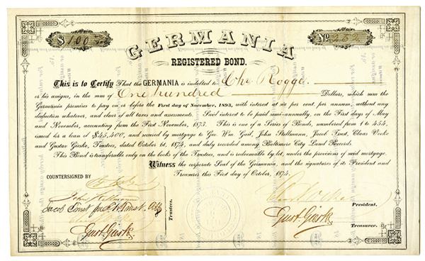 Baltimore, Maryland. $100 I/U 6% Registered Bond, Black text with black border. Fine condition. Baltimore had a large German population and the Germania was probably the Germania Club.