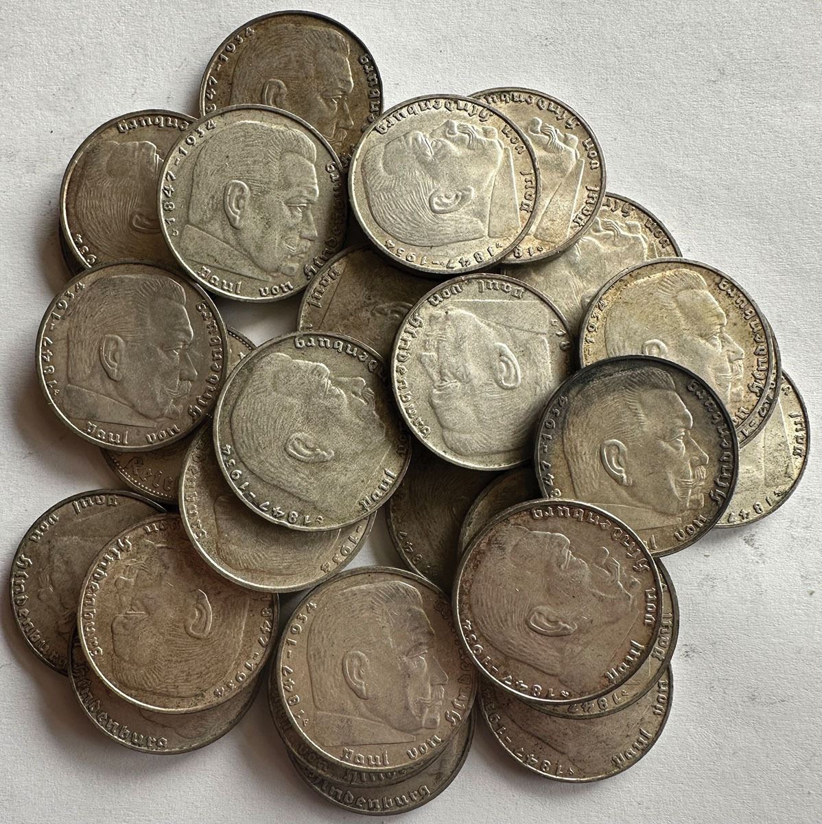 Germany. Attractive group of 30 German, 2 Reichsmark silver coins, all dated 1939 and featuring the Paul von Hindenburg portrait obverse with the imperial eagle reverse. Mixed mintmarks are present, typical of the issue. Struck in .625 silver, each coin contains 0.1607 troy oz of pure silver, for a combined silver weight of 4.821 troy oz. Conditions range from XF to AU, with many showing sharp details, light wear, and a number exhibiting original luster. A solid, desirable pre-WWII German silver accumulation with strong collector interest at this grade level.