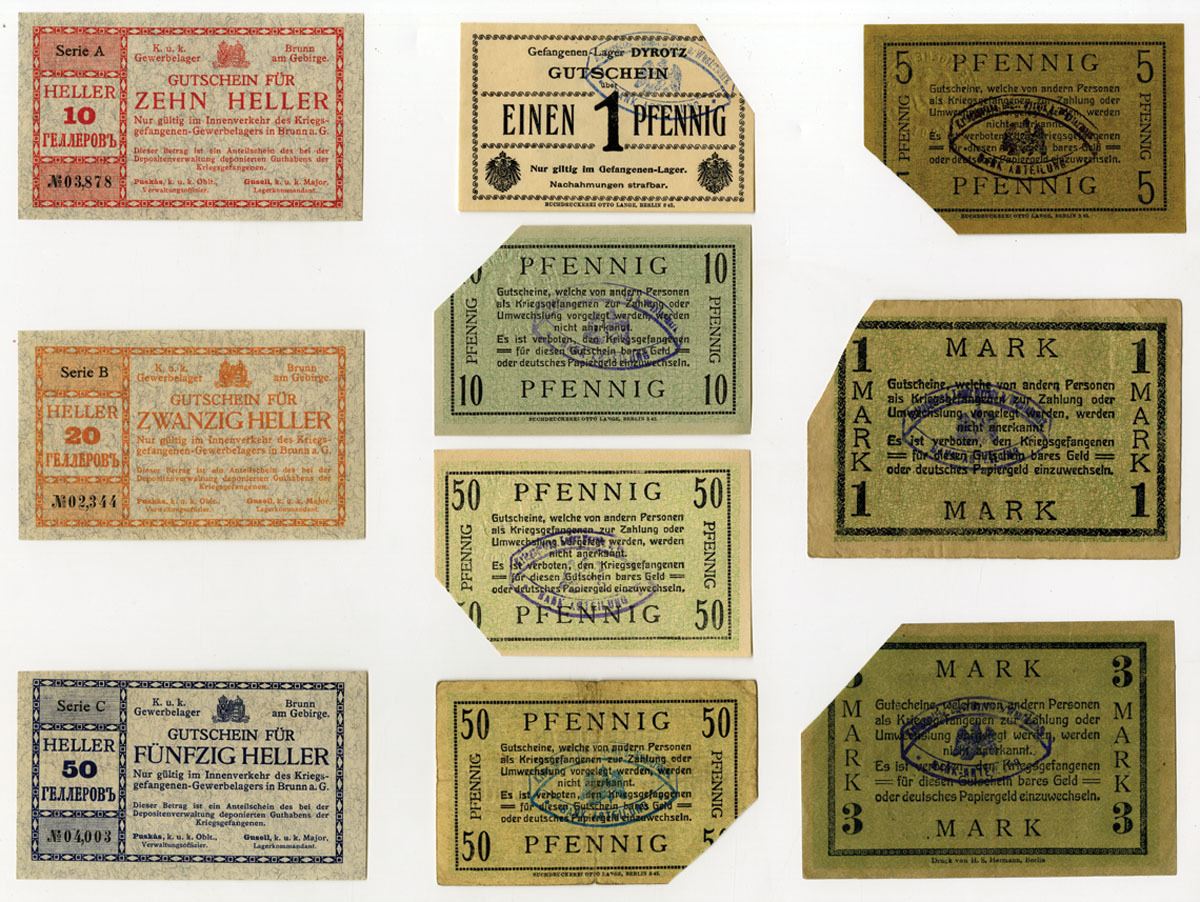 Germany and Austria, ND (1914-18). Lot of 10 Issued Banknotes, Includes: Dyrotz P.O.W Camp 50 Pfennig (K-42a), 1 Pfennig, 5 Pfennig, 10 Pfennig, 50 Pfennig (K-42b), 1 Mark, & 3 Mark (K-42c). Notes are all cut cancelled at top right corner; Brunn am Gebirge P.O.W. Camp 10 Heller, 20 Heller, & 50 Heller. Notes range from Fine to Uncirculated condition. (10). Sold "AS IS" no returns accepted.