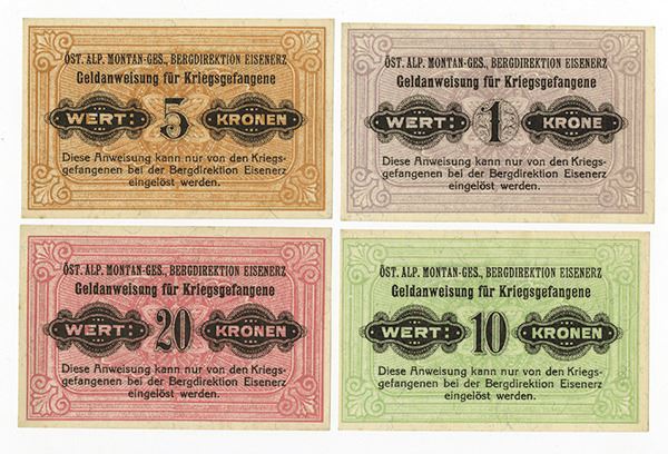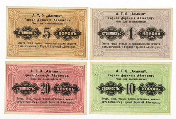 Russia, Germany and Austria, Lot of 4 notes, Includes 1; 5; 10; 20 Kronen, face written in German and the back written in Russian. Note says "ST. ALP, MONTAN GES BERGIREKTION EISENERZ Money statement for prisoners of war" and "This directive can only be used by the prisoners of war at the Iron Ore Ministry", Uncirculated, rare Russian POW scrip notes.