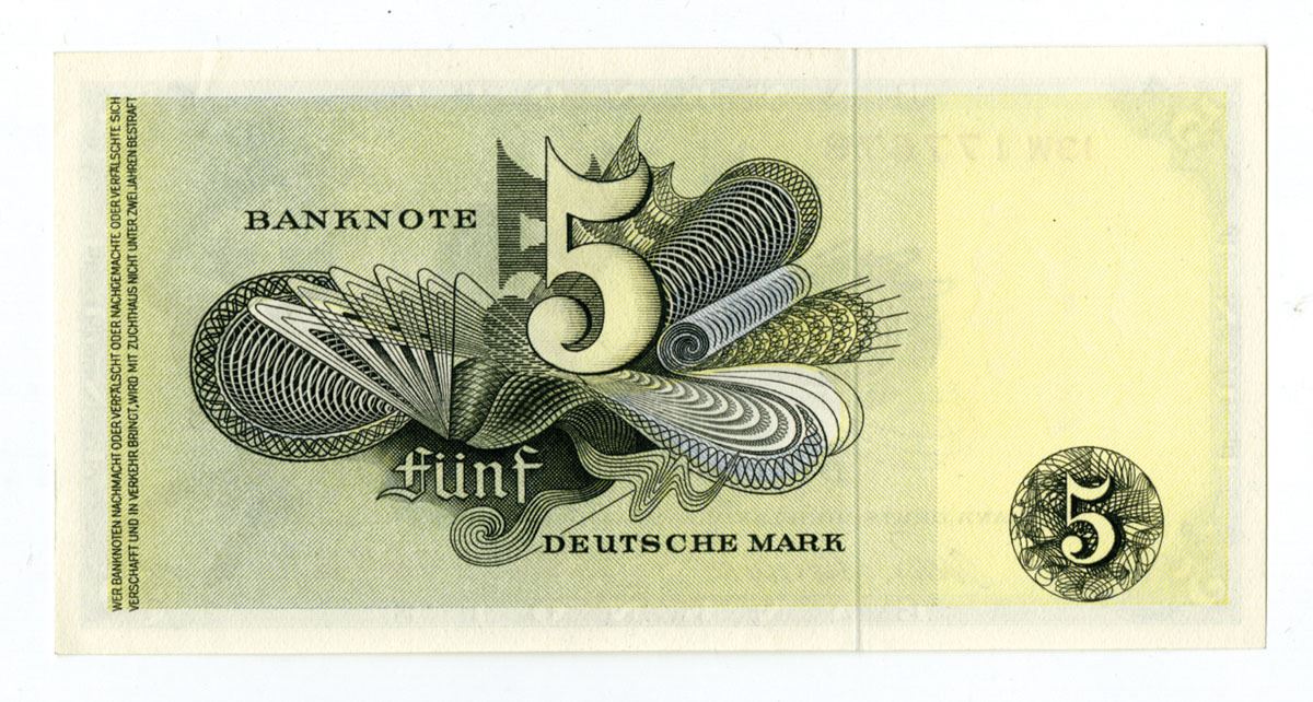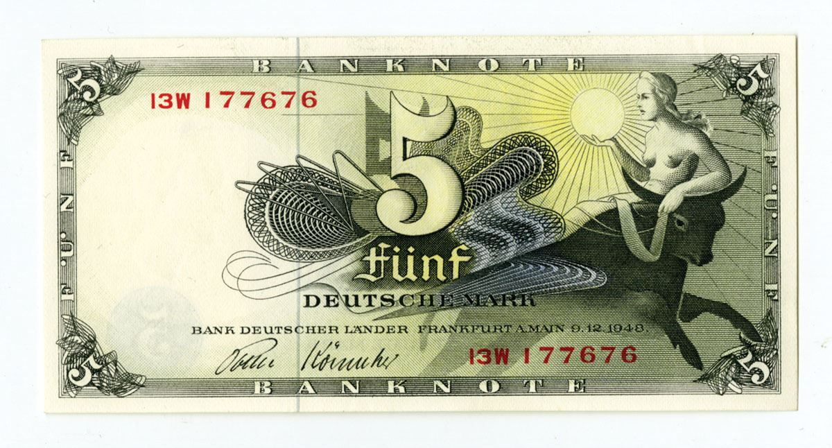 Germany - Federal Republic....., 1948. 5 Deutsche Mark, P-13e, Issued Banknote, Black on green and yellow underprint with woman (Europa) on the bull at right, Back is green and yellow with denomination at center, S/N 13W 177676, Note is un AU to Choice AU condition. TDLR.