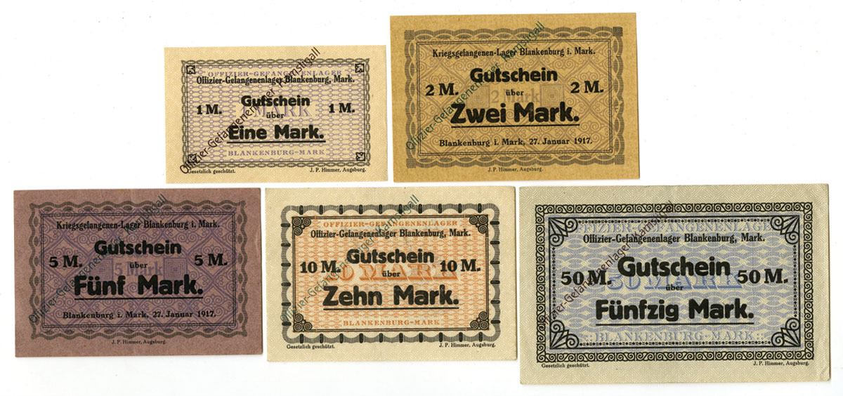 Germany. Lot of 5 Officer, Prisoner of War camp money includes 50 Mark; 10 Mark; 5 Mark; 2 Mark; and 1 Mark. Handstamp and hand cancellation on back, uniface otherwise. All in About to Choice Unc condition. (5). Sold "AS IS" no returns accepted.