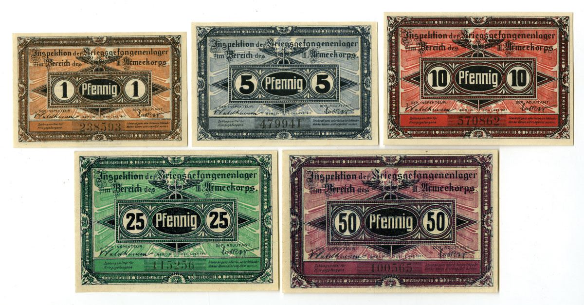 Bradenburg-Havel, Germany, 1917. Lot of 5 Issued Notgeld notes from the Inspektion der Kriegsgefangenenlager im Bereich des III. Armeekorps, consisting of 1, 5, 10, 25, and 50 Pfennig denominations, each with ornate borders, Imperial eagle at top center, bold denomination panels, individual serial numbers, and printed signatures of camp authorities. Issued for use within German prisoner of war camps during World War I as internal camp currency. Notes range from Uncirculated to CU condition with strong color and eye appeal overall. (5) Sold “AS IS” no returns accepted.