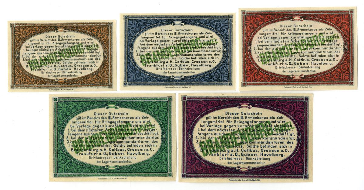 Bradenburg-Havel, Germany, 1917. Lot of 5 Issued Notgeld notes from the Inspektion der Kriegsgefangenenlager im Bereich des III. Armeekorps, consisting of 1, 5, 10, 25, and 50 Pfennig denominations, each with ornate borders, Imperial eagle at top center, bold denomination panels, individual serial numbers, and printed signatures of camp authorities. Issued for use within German prisoner of war camps during World War I as internal camp currency. Notes range from Uncirculated to CU condition with strong color and eye appeal overall. (5) Sold “AS IS” no returns accepted.