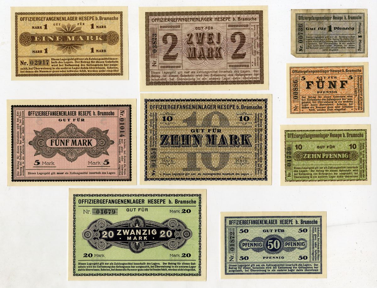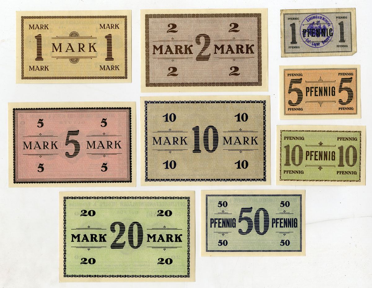 Bramsche, Germany, 1917. Lot of 9 Banknotes from 1 Pfennig to 20 Mark, Each note is a different color and size, Notes range from Fine to CU condition. (9). Sold "AS IS" no returns accepted.