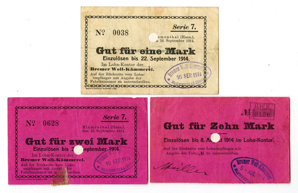 Blumenthal, Hanover, Germany, 1914. Lot of 3 I/C scrip notes from Bremer Woll-Kämmerei, Includes: 1 Mark; 2 Mark; 10 Mark. Printed on colored paper with decorative borders, serial numbers, and company stamps, and POCs at center. These notes were issued as industrial wage scrip during the early period of World War I for use within the company’s payroll system. Notes range from Fine to VF overall with folds, minor staining, tape remnants on one example, and small punch holes. (3). Sold “AS IS” no returns accepted.