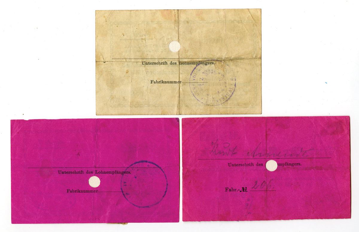 Blumenthal, Hanover, Germany, 1914. Lot of 3 I/C scrip notes from Bremer Woll-Kämmerei, Includes: 1 Mark; 2 Mark; 10 Mark. Printed on colored paper with decorative borders, serial numbers, and company stamps, and POCs at center. These notes were issued as industrial wage scrip during the early period of World War I for use within the company’s payroll system. Notes range from Fine to VF overall with folds, minor staining, tape remnants on one example, and small punch holes. (3). Sold “AS IS” no returns accepted.