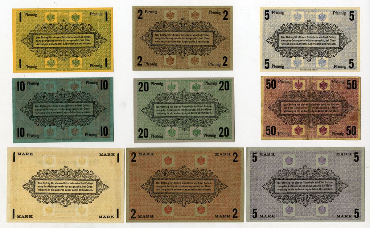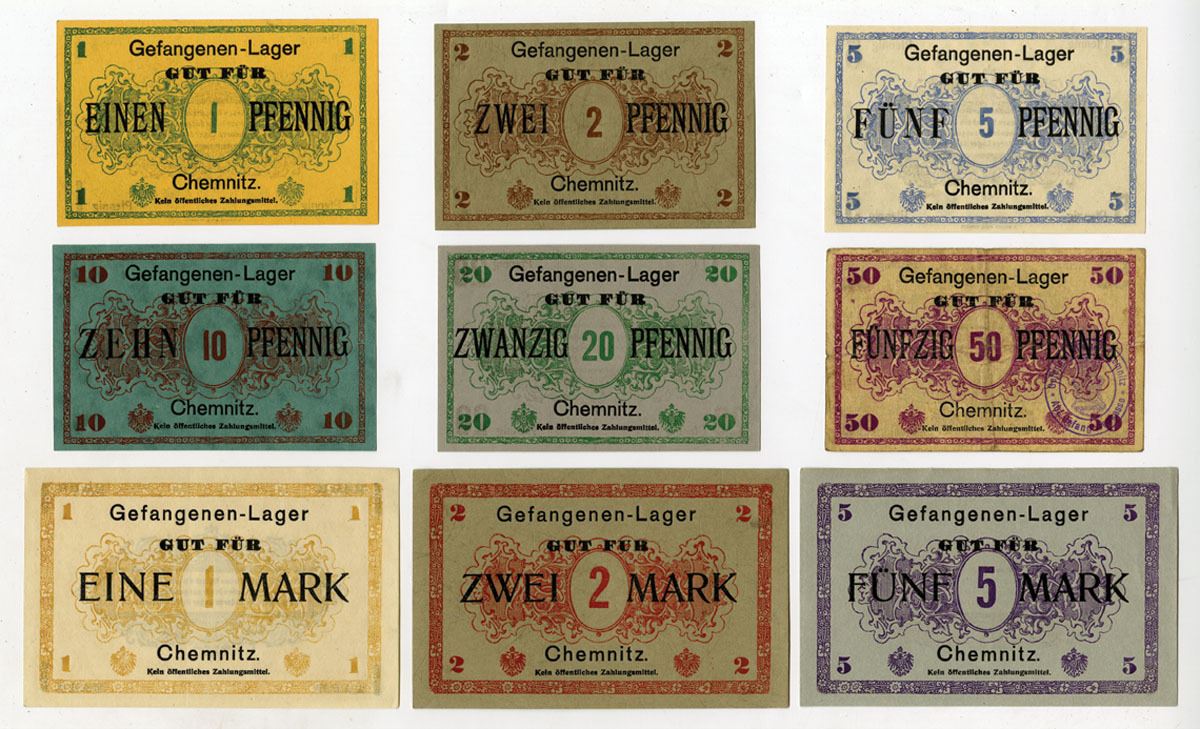Chemnitz, Germany, ND (1914-17). Lot of 9 Issued Notgeld used in Chemnitz POW Camp run by XIX Army Corps out of Leipzig, Lot includes: 1 Pfennig, 2 Pfennig, 5 Pfennig, 10 Pfennig, 20 Pfennig, 50 Pfennig, 1 Mark, 2 Mark, and 5 Mark. The Germans built the camp shortly before the war and incarcerated Allied prisoners here in 1914. Notes are in Uncirculated to CU condition. (9). Sold "AS IS" no returns.