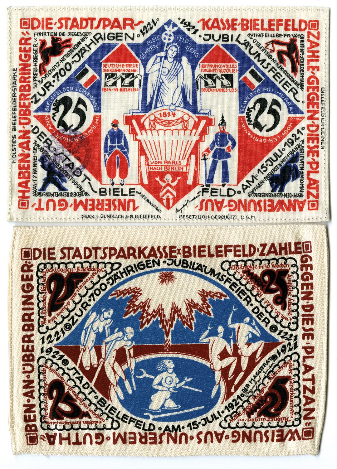 Germany. Lot of 2 notes, includes a pair of colorful linen or silk 25 Mark Notgeld. About to Choice Unc. (2)