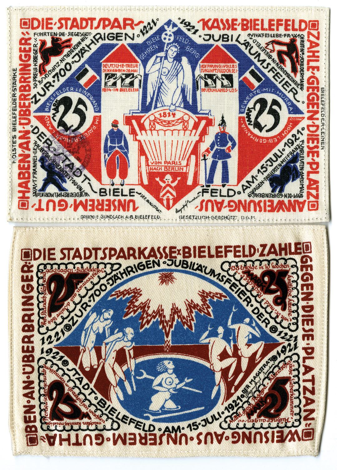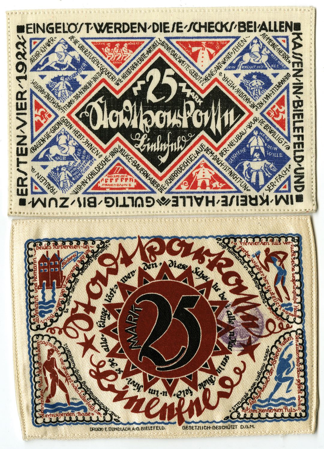 Bielefeld, Germany. Lot of 2 notes, includes a pair of colorful linen or silk 25 Mark Notgeld. About to Choice Unc. (2)