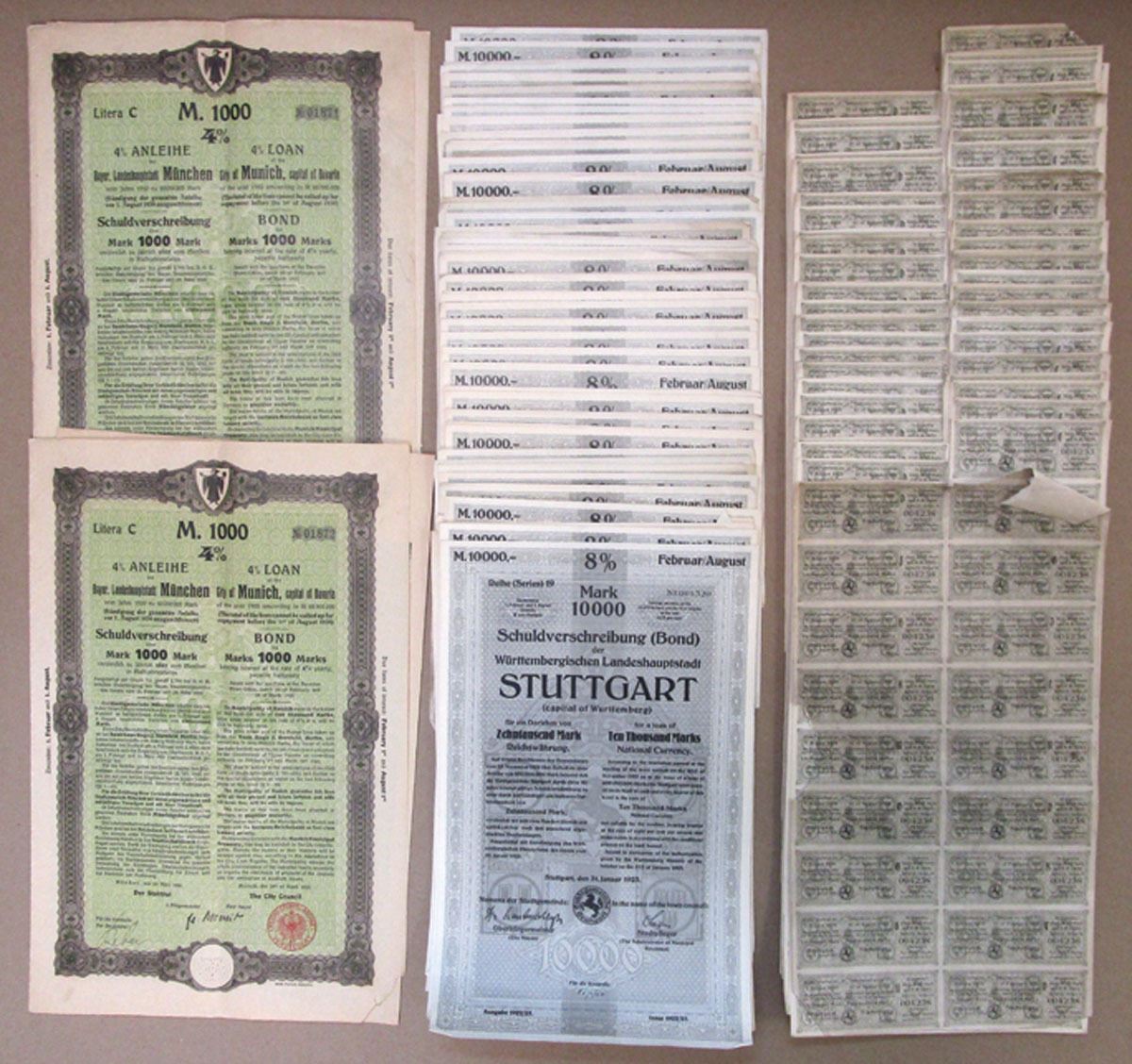Stuttgart, and Munich, Germany, 1923. Lot of 137 Pieces (69 Bonds and 68 Coupon Sheets) 10,000 Mark I/U 8% Bonds printed in German and English, Coupon Sheets have some coupons missing, VF to XF condition. Also includes 2 different Munich bonds dated 1920, (137). Sold "AS IS" no returns accepted.
