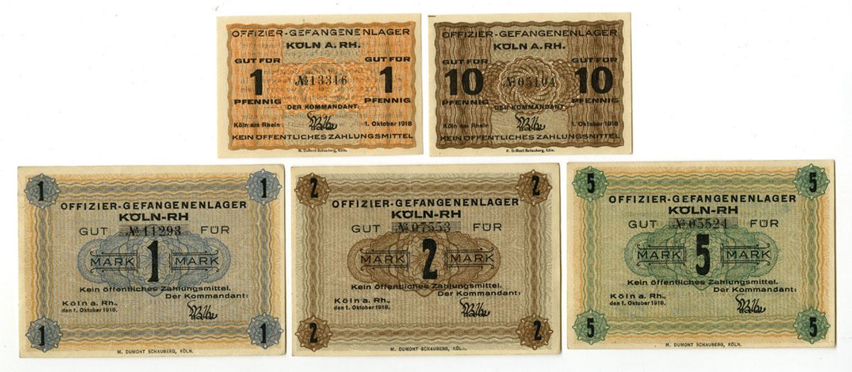 Koln, Germany, 1918. Lot of 5 Notes used in the Officers camp in Koln (Cologne), Includes: 1 Pfennig.,10 Pfennig, 1 Mark, 2 Mark, and 5 Mark. The Pfennigs and Marks are different sizes and notes are in different colors. VF to XF condition. (5). Sold "AS IS" no returns accepted.