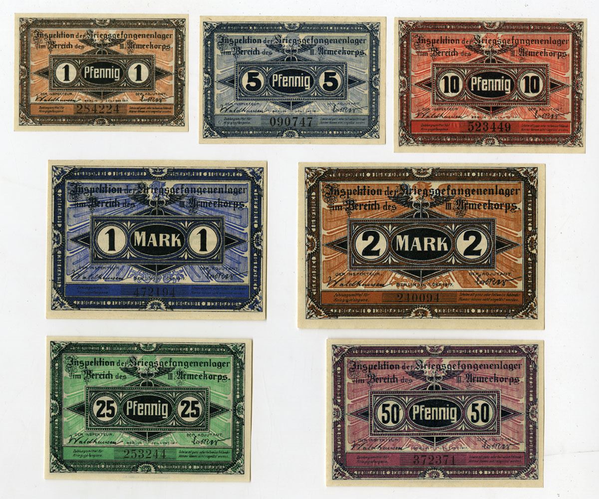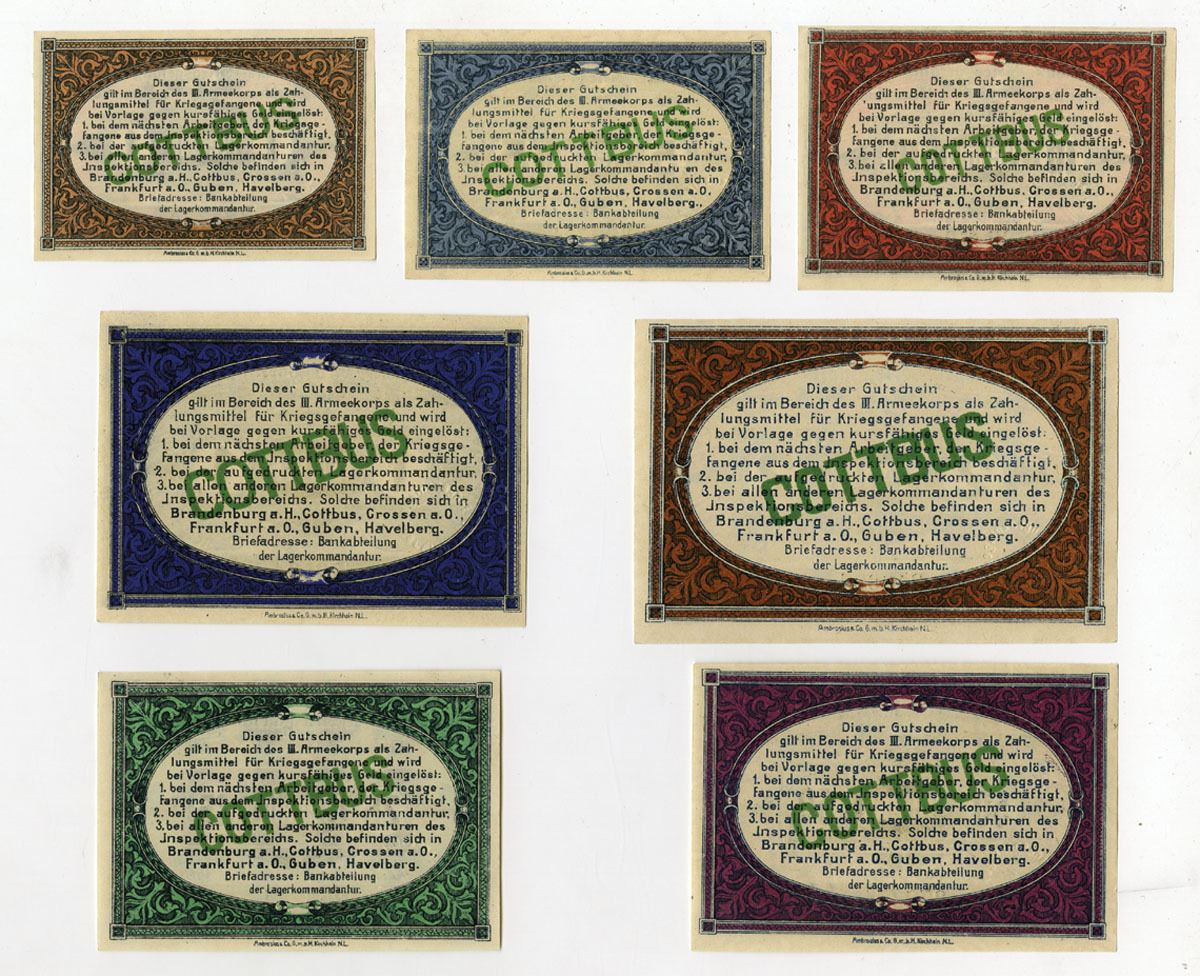 Cottbus, Germany, 1918. Lot of 7 Banknotes ranging from 1 Pfennig to 2 Mark, Each note is a different and size, All are stamped with "Cottbus" on back and range from AU to CU condition. (7). Sold "AS IS" no returns accepted.