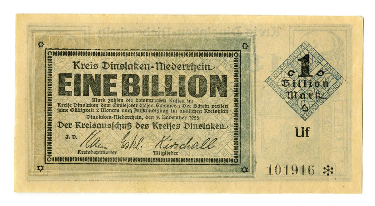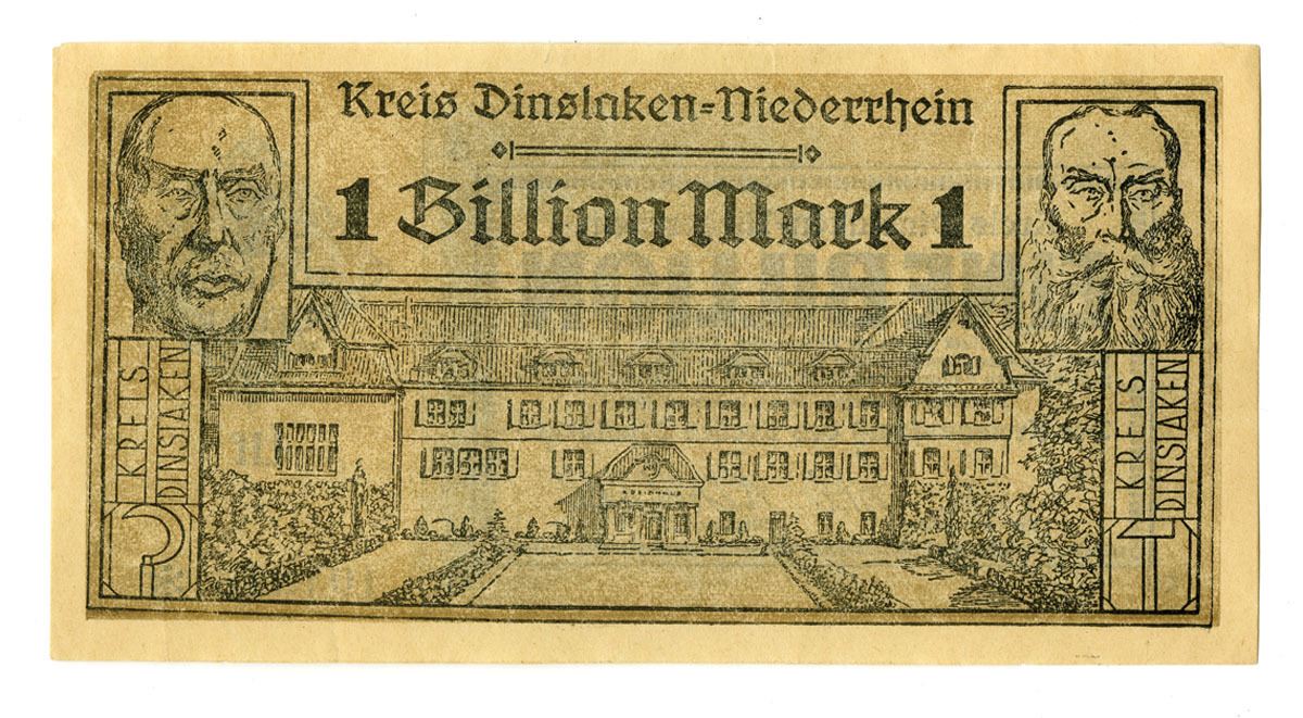 Dinslaken-Niederrhein, North Rhine–Westphalia, 1 Billion Mark district emergency note dated 9 November 1923, issued during the peak of German hyperinflation. Obverse features engraved portraits of district officials and a detailed view of the Dinslaken administrative building; reverse carries the framed denomination 'Eine Billion,' official signatures, district crest, and serial number. Issued with 2-month validity and redeemable at the district treasury. A classic late-inflation municipal Notgeld issue.